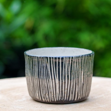 Ce pot noir et beige en grès est une pièce unique réalisée dans mon atelier de Seine-et-MarneLes stries de ce pot sont laissées neutres pour laisser les cristaux apparaitre. Ce pot s'intègre parfaitement dans la décoration intérieure.