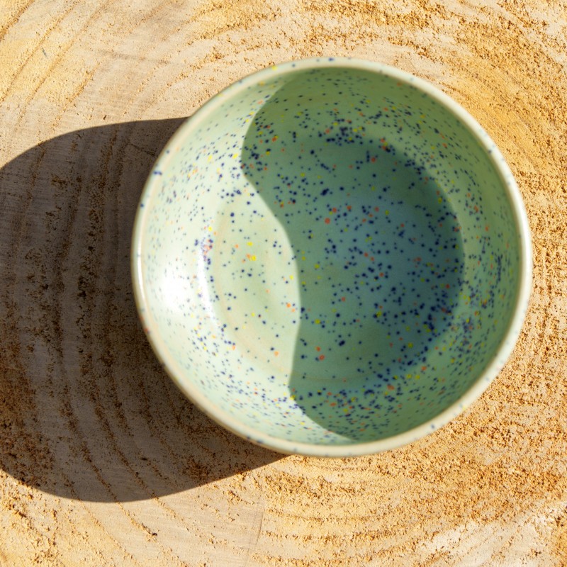 Ramequin vert avec des cristaux bleus et oranges.