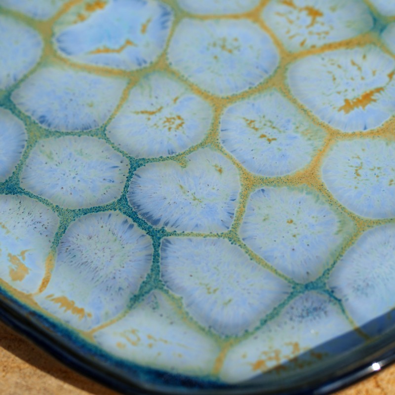 Coupelle décorative motif écailles vertes, jaunes et bleues.