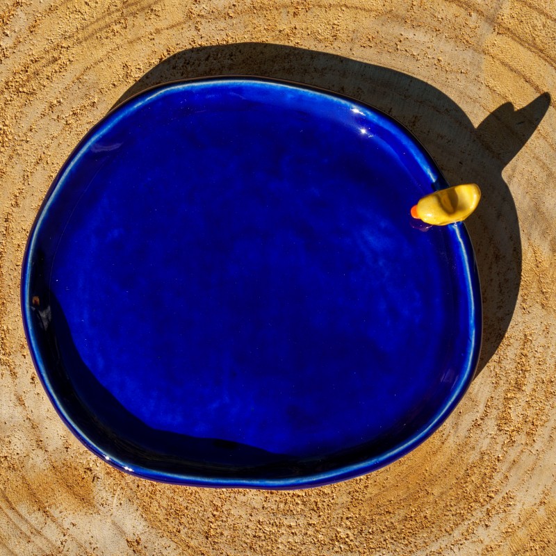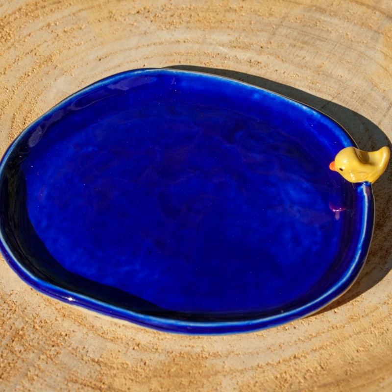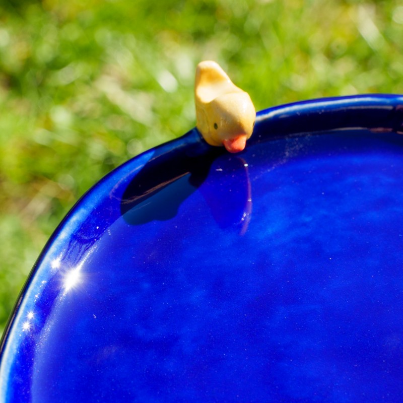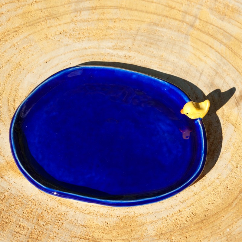 Une coupelle bleue avec un petit oiseau jaune sur son bord.