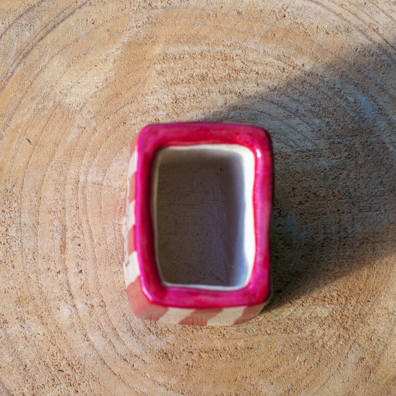 Pot en céramique rouge et beige avec l'inscription Pop Corn