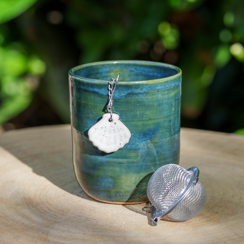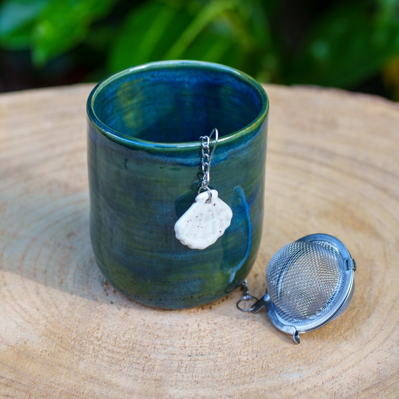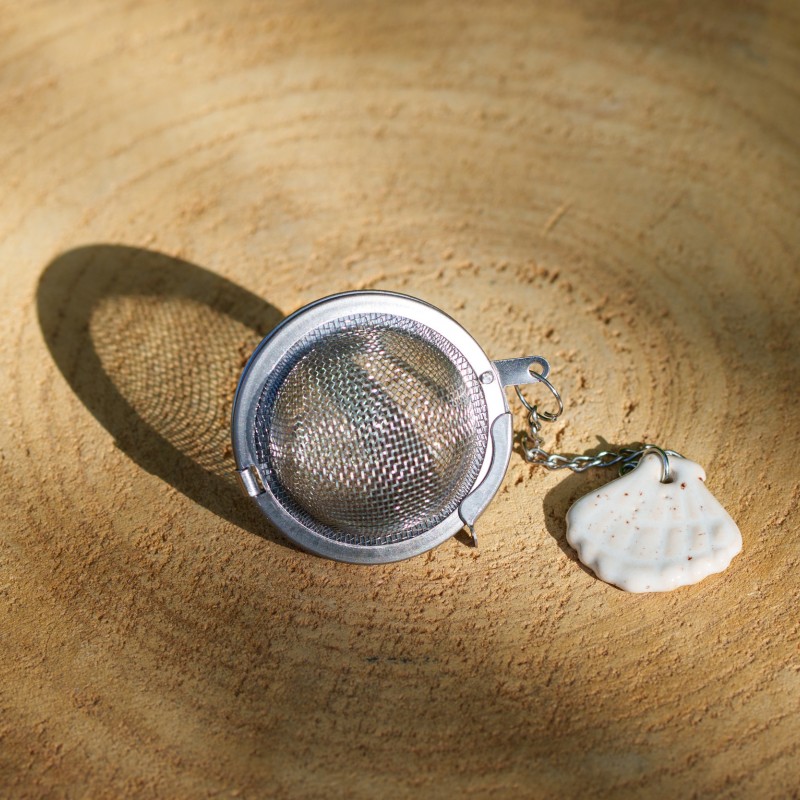 Boule à thé en acier inoxydable avec sa décoration coquillage en grès
